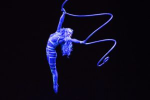 Corde Lisse & Silks – You’ll want costume fabric that has some grab to it, so higher cotton blends are a good thing to pay attention to. Fabrics which are higher in spandex than cotton can slip more in the apparatus. That doesn’t mean you necessarily need to stay away from those fabrics, just that they require a little more of your own strength to hold you there rather relying on a grippy fabric doing some of that work for you. It is also important to make sure your costume fits snugly against your body to avoid wrapping the costume up in the rope or silks during your act.